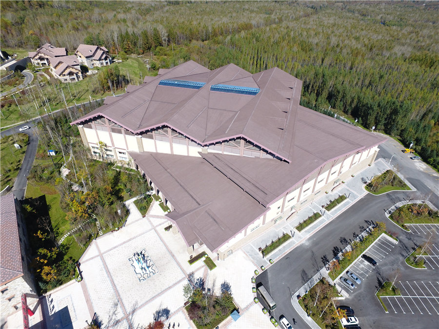 • 产品描述:万达长白山水乐园,采用管桁架结构,面积25000平方米,单榀钢梁260吨,跨度100米,屋面采用铝镁锰板及采光天窗系统。